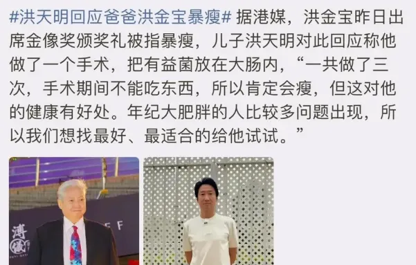 对此,儿子洪天明在出席活动时给出了答案。原来,洪金宝接受了三次有益菌植入大肠的调理手术。手术期间,为保证效果,需严格禁食,这才导致体重下降。