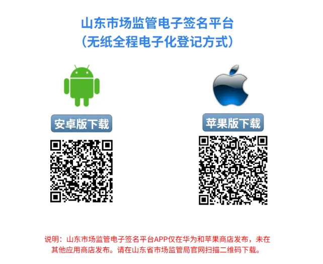 第一步:扫码下载山东省市场监管全程电子化APP,根据手机操作系统的类型,选择“安卓版下载”或“苹果版下载”,用微信扫描二维码下载即可。