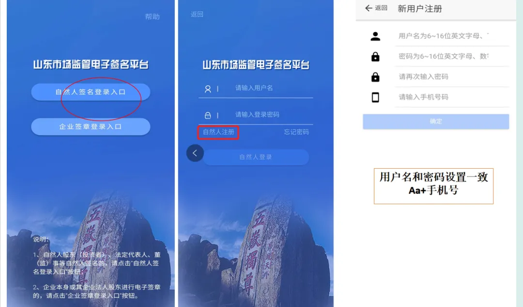 第二步:下载完成后,点击自然人签名登录入口,若是新用户/忘记密码直接点击自然人注册,重新注册就行,建议用户名和密码一致(Aa+手机号)方便记忆。