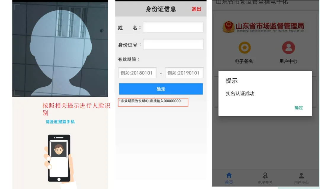 第三步:实名扫脸认证,按照提示做对应动作(注意扫脸时周围环境以免操作失败);身份证信息:姓名、身份证号码和身份证反面的有效日期(注意有效期限为长期的,直接输入8个0,中间不要输入符号)。