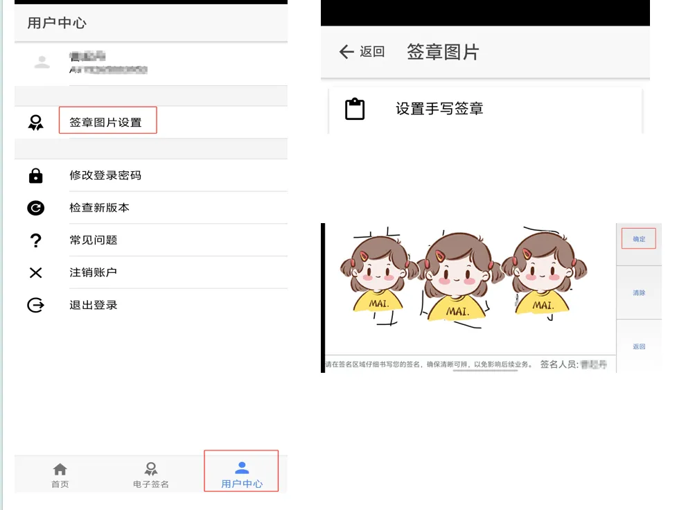 第四步:实名认证成功后,点击用户中心-签章图片设置-设置手写签章-点击确定(注意字体楷书不要连笔)。