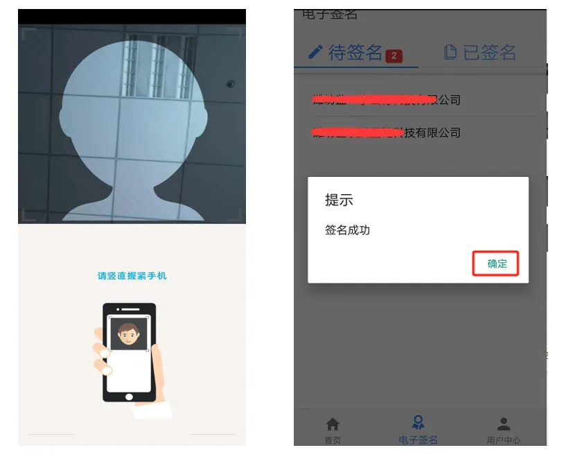 第六步:进入扫脸实名验证界面(每次签名都需要进行刷脸实名验证),扫脸完成后,提示签名成功,点击确定;签名步骤完成。