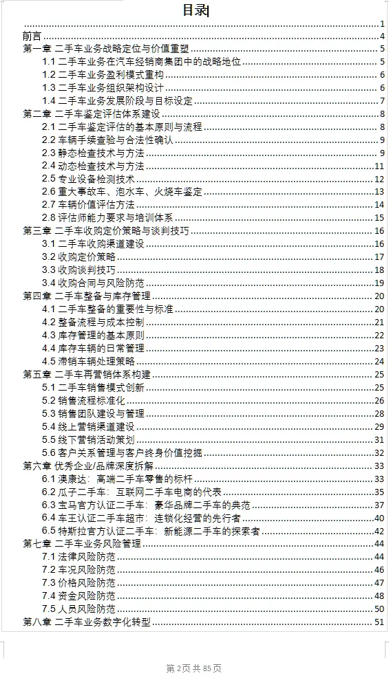 二手车行业正处于快速变革与升级的关键时期,机遇与挑战并存。希望本手册能够成为汽车销售总经理的“案头工具书”,为企业二手车业务的布局与发展提供有益参考,助力企业在存量市场竞争中抢占先机、实现突破,推动中国二手车行业朝着规范、专业、高效的方向持续前行。