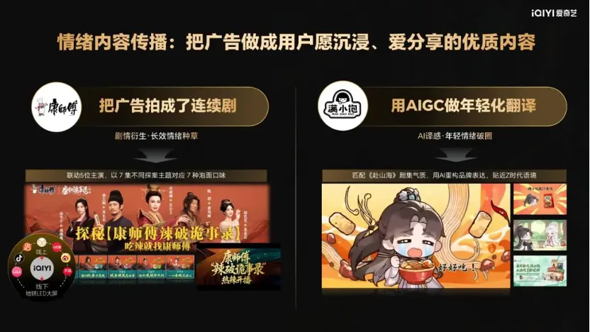 情绪场景占位的核心,是让产品成为特定情绪下的具象化载体。以王小卤为例,通过精准切入年轻人追剧嘴馋的场景,在爱奇艺平台的热剧中高频出现。当观众追剧上头、嘴馋难耐时,王小卤恰到好处地陪伴,成功将自身塑造成年轻人的“追剧搭子”。再如酒鬼酒与爱奇艺漫剧的合作。借助AI技术将产品自然植入江湖场景,让酒鬼酒化身为主角腰间的随身之物、庆功宴的首选,成为江湖豪情的温暖媒介;而喜之郎则与动画IP《音乐公主爱美莉》深度绑定,在公主唱跳追梦的路上,喜之郎一路相伴,将小朋友对IP的喜爱自然转移到产品上。无论什么品类、何种情绪,核心始终如一:在合适的场景与情绪里,让品牌成为用户情感释放时的“隐形主角”。