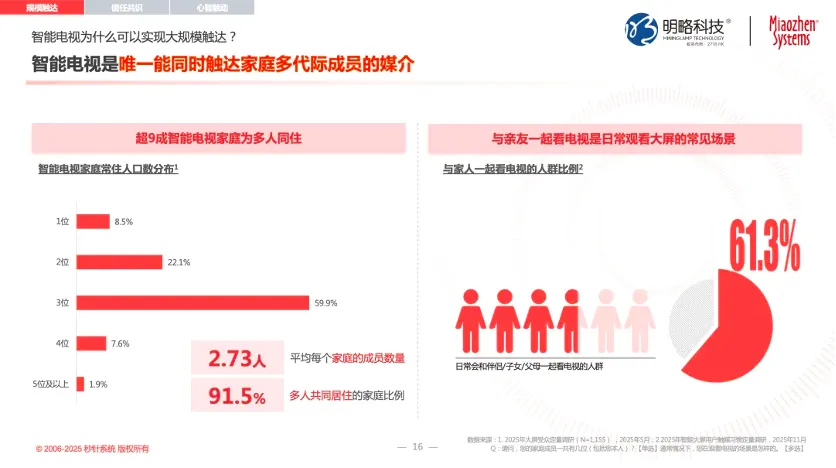 作为家庭基础硬件,智能电视已覆盖超9亿用户,是品牌不可忽视的流量场。秒针调研结果显示,超九成智能电视家庭为多人同住,户均成员2.73人。与亲友一同观看,是家庭大屏使用的典型场景。