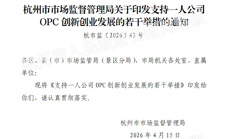 AI时代,创业不再需要“组队”!一个人、一台电脑、一套AI工具,就能撑起一家公司——这就是杭州正在加速崛起的一人公司(OPC)。4月15日,杭州市市场监督管理局重磅出台OPC专项支持政策,从注册到经营、从维权到融资,十二项举措精准破解创业痛点。