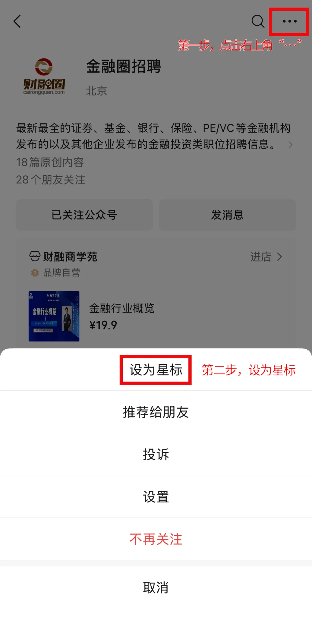 操作方法:点击文首蓝字关注【金融圈招聘】,进入主页后点击右上角菜单栏,设为星标!