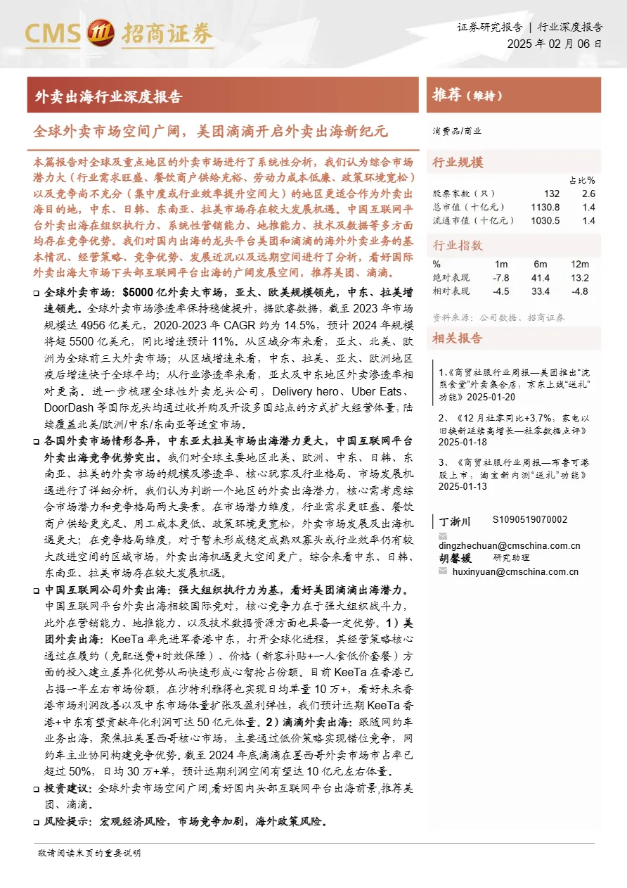 • 远期盈利空间可观:美团KeeTa中东+香港有望年赚50亿:报告测算,KeeTa在港市占率已达50%,未来若在中东市占率达50%,年GMV有望达210亿美元,按3% EBITDA margin估算,年利润约45亿元。滴滴墨西哥外卖市占超50%,远期利润空间约10亿元。