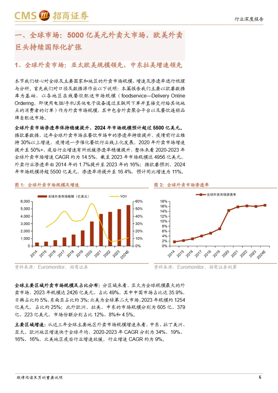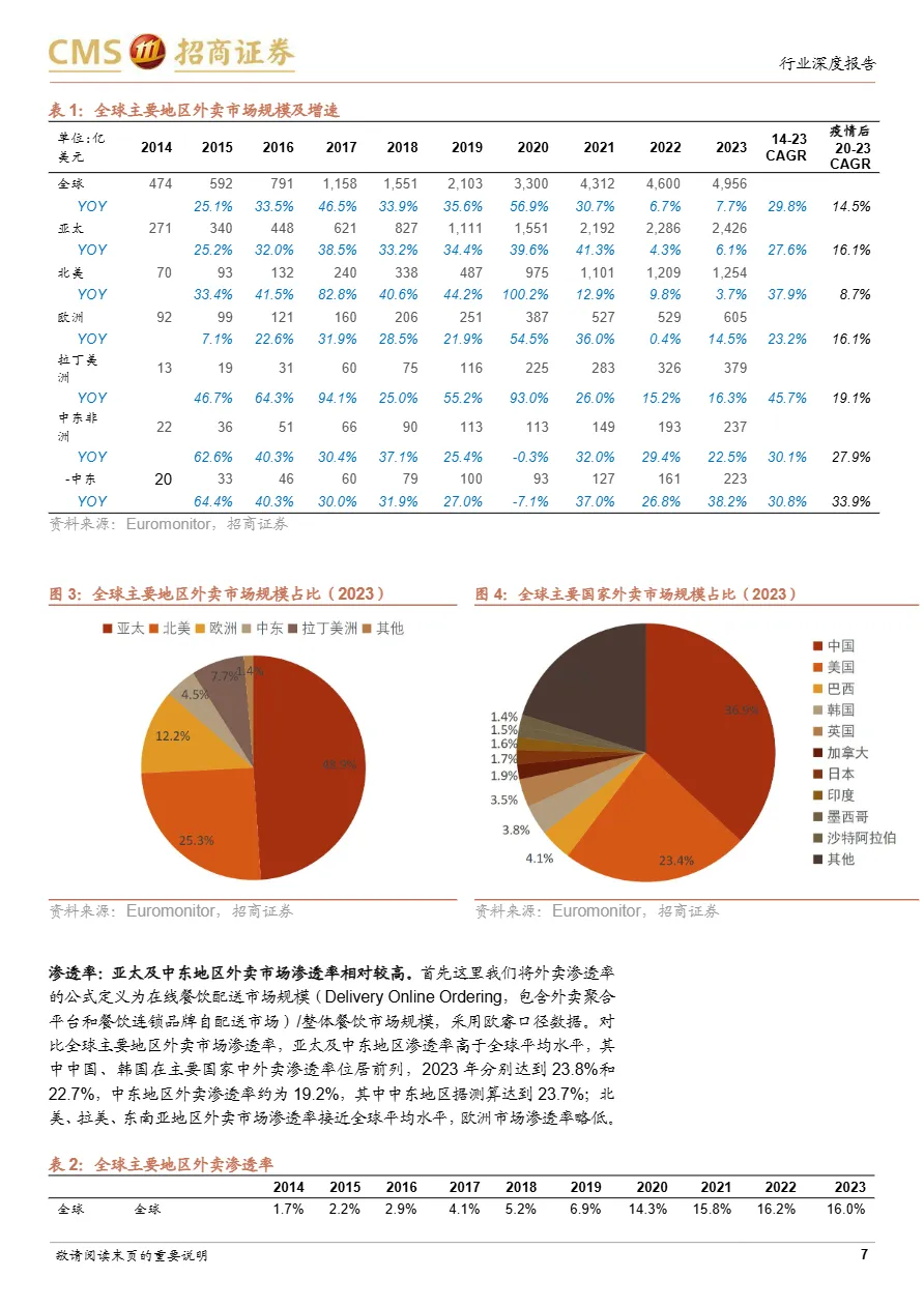 • 全球市场规模达4956亿美元,中东、拉美增速领跑:2023年全球外卖市场规模达4956亿美元,2020-2023年CAGR为14.5%。其中,中东(CAGR 34%)、拉美(CAGR 19%)为增速最快的两大区域,远超北美(9%)和欧洲(16%),成为出海首选高潜力市场。
