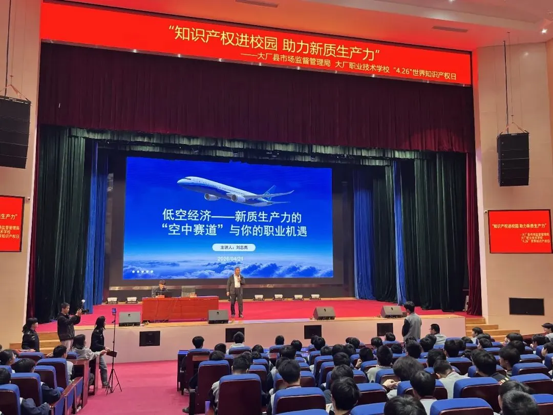 为进一步加大知识产权法律知识宣传普及力度,提升学生尊重和保护知识产权意识,营造敢于创新、尊重知识的良好校园文化氛围,在“4·26世界知识产权日”到来之际,大厂县市场监管局以“低空经济-新质生产力的空中赛道”为主题,深入县职业技术学校,开展“知识产权进校园”宣讲活动。