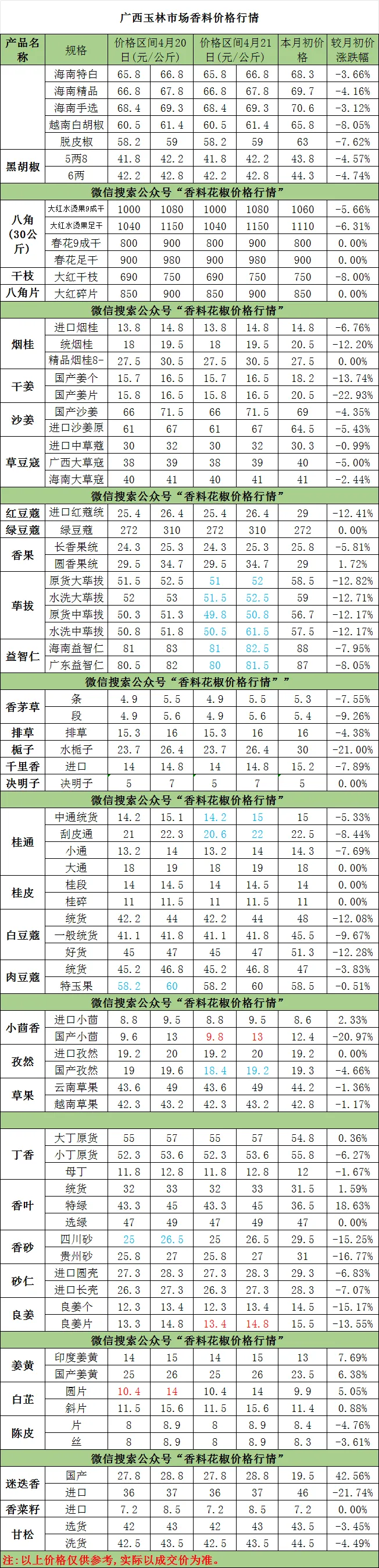2026年4月21日产地部分药材、玉林市场香料价格行情