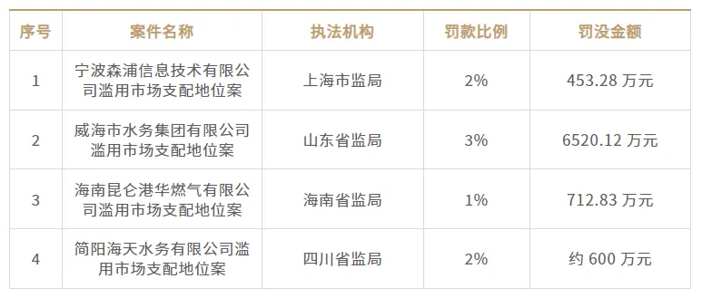 2024 年 9 月,山东省市场监督管理局对威海市水务集团有限公司作出行政处罚决定,认定其滥用市场支配地位,限定用户只能由其进行新建住宅小区供水设施设计和施工,并无合法收费依据收取用户建筑区划红线外供水接入工程和排水工程费用。执法机构没收违法所得 3499.56 万元,并处 2022 年度销售额 3% 的罚款 3020.56 万元,罚没款合计 6520.12 万元。