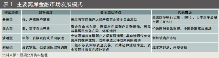 当前,全球离岸金融市场可划分为分离型、混合型、渗透型与避税型四种主要模式。表1展示了主要离岸金融市场发展模式。这些模式在监管强度、资金流动安排等方面存在显著差异,反映了不同司法辖区在金融开放与风险防控之间的权衡。
