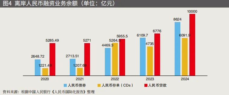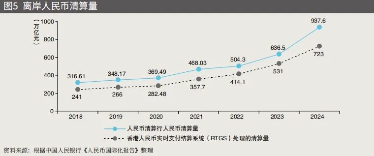 如图4所示,2020年至2024年,离岸人民币债券、存单和贷款业务均实现规模增长。从离岸人民币债券来看,2024年,离岸人民币债券发行活跃,全年新发行规模达9254.7亿元,同比增长38.1%,其中香港地区发行量占八成以上,继续发挥核心发行平台作用。从离岸人民币存单来看,该市场亦稳步发展。截至2024年末余额为6091.9亿元,同比增长28.7%,为金融机构提供了重要的短期融资与流动性管理工具。从离岸人民币贷款来看,离岸人民币贷款规模在5年间接近翻番,2024年末突破1万亿元,其中香港地区贷款余额为7235亿元,反映出离岸人民币在支持企业跨境贸易、投资与经营中的实际作用不断增强。总而言之,离岸市场已形成以债券为长期融资主渠道、以存单为短期工具补充、以贷款满足多样化需求的多层次融资体系,不仅提升了人民币的跨境金融服务能力,也为人民币国际化进程提供了坚实的市场支撑。