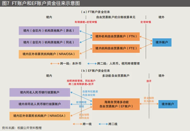 从账户体系来看,两地账户体系运行活跃,为境内人民币离岸业务提供了高效、便利的资金往来通道。上海自贸区以自由贸易账户(FT账户)为依托开展境内人民币离岸业务。截至2025年4月,上海累计开立各类FT账户17.74万个,发生本外币跨境收支折合人民币年均增速超30%,非居民企业通过FT账户办理跨境收支折合人民币年均增速近40%。海南自贸港则主要以自由贸易账户和多功能自由贸易账户(EF账户)开展业务。2024年FT账户收支折合人民币1.33万亿元,同比增长89.07%。EF账户自2024年5月上线以来发展迅猛。截至2025年9月,共开立EF账户超过480个,资金往来范围覆盖全球61个国家和地区,并完成了超1700亿元跨境资金结算。图7展示了FT账户和EF账户资金往来的机制,FT账户遵循“一线宏观审慎,二线有限渗透”的原则,EF账户则遵循“一线放开,二线按照跨境管理,同名账户跨二线有限渗透原则”,两账户体系都在把控风险的条件下打通了人民币离岸资金跨境双向流动通道,提高了境内外人民币循环的联动性。