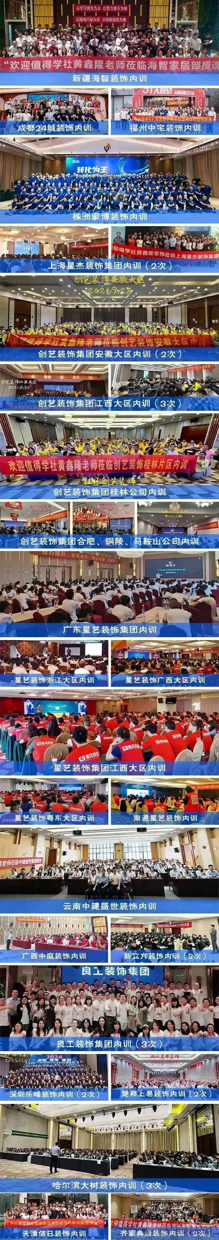 方林装饰集团,早在 2018 年,方林集团在连续三场培训后,便对课程体系与实战价值高度认可。2021 年,企业在全国扩张、高速发展的关键阶段,集团商学院依旧将组织成长放在战略核心,正式邀请黄鑫隆老师为集团进行深度内部赋能。2022 至 2023 年,合作进一步升级,面向全国各分公司开展全员营销体系化培训,以学习力支撑扩张力,用认知升级驱动业绩增长。