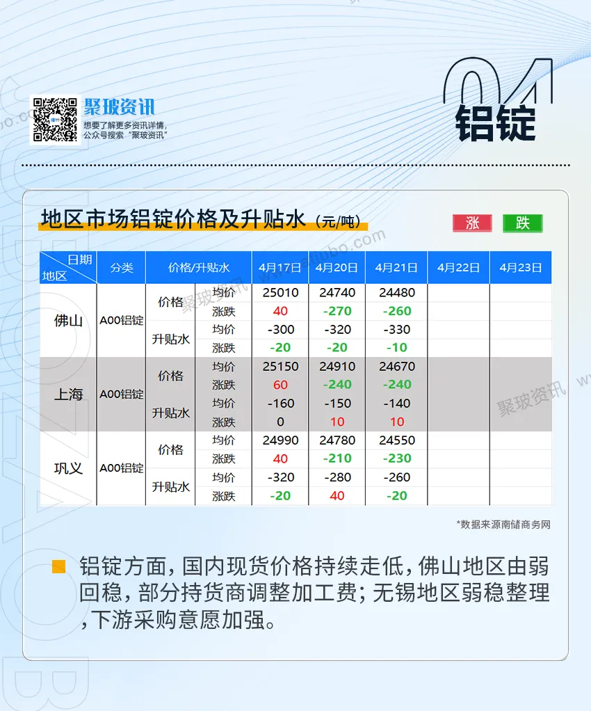 4.22:华北、华南、华中地区市场价格窄幅下行,玻璃现货市场弱势运行,期价震荡走低.国内铝市延续弱势回调,期现同步下探.