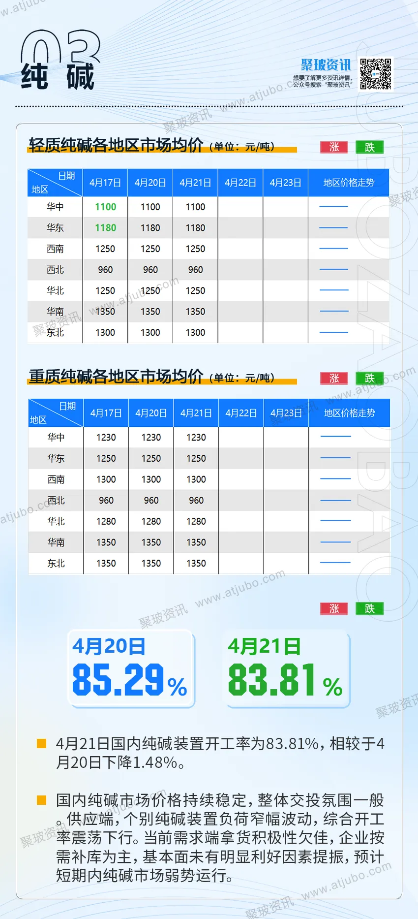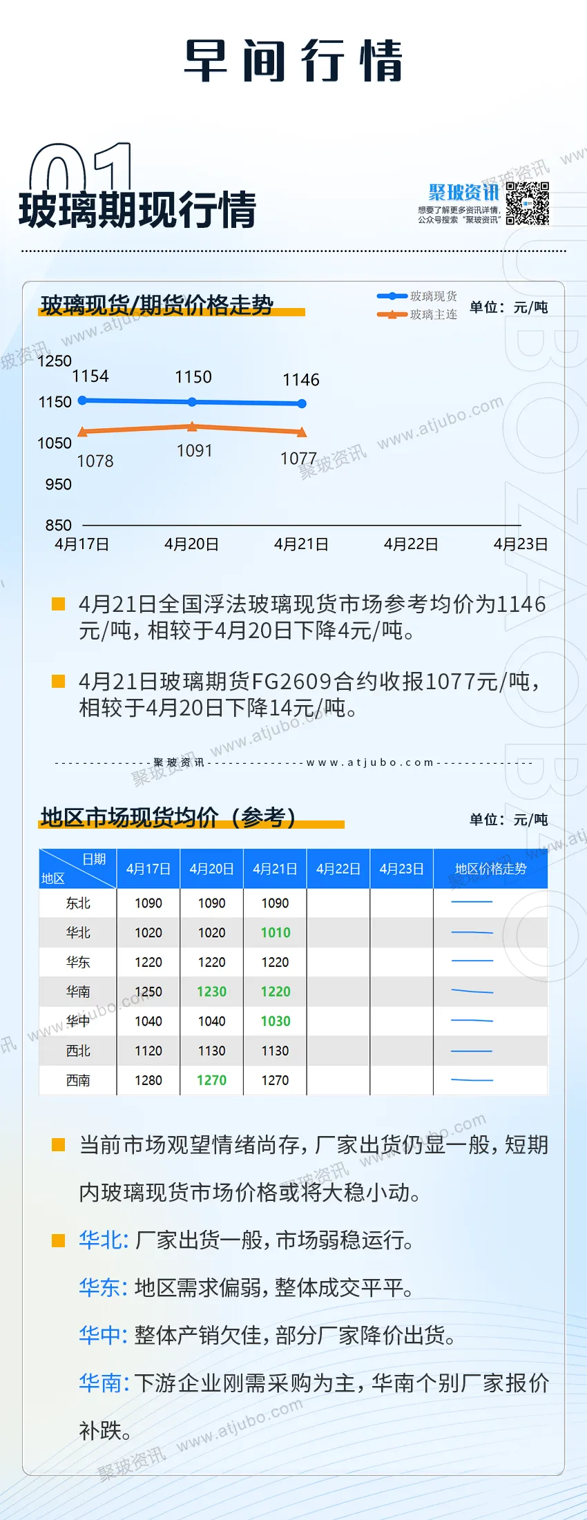 4.22丨聚玻资讯:华北、华南、华中地区市场价格窄幅下行,玻璃现货市场弱势运行,期价震荡走低。国内铝市延续弱势回调,期现同步下探。