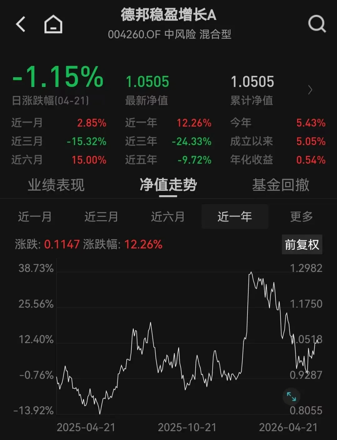 先看数据。根据天天基金的数据,德邦稳盈增长A最新的单位净值是1.0505元(截至2026年4月21日),成立以来的累计收益是5.05%。但这只基金2017年3月10日就成立了,也就是说,快9年的时间里,年化收益还不到1%。这个成绩实在算不上优秀。