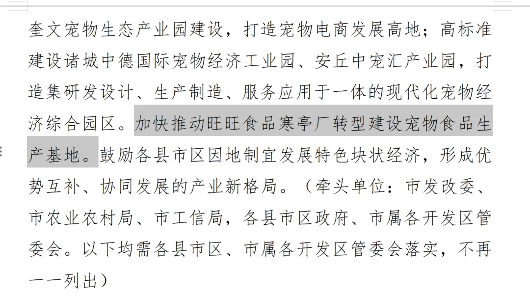 这一信号很快被后续动态进一步坐实。潍坊市发布的《关于促进宠物经济高质量发展的意见》提出,将加快推动旺旺食品寒亭厂转型,建设宠物食品生产基地,并提出当地宠物经济力争达到百亿元规模的目标。