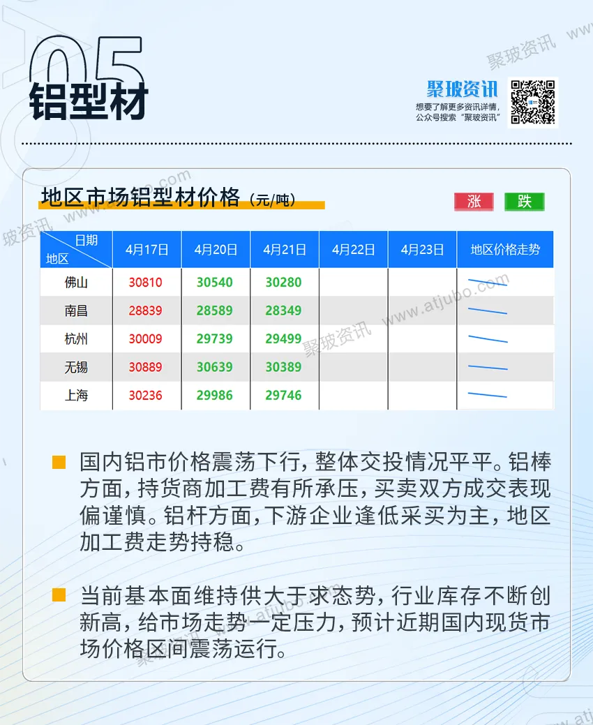 4.22:华北、华南、华中地区市场价格窄幅下行,玻璃现货市场弱势运行,期价震荡走低.国内铝市延续弱势回调,期现同步下探.