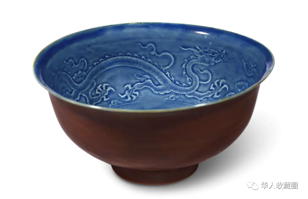 明洪武 外酱釉内蓝釉暗花云龙纹碗