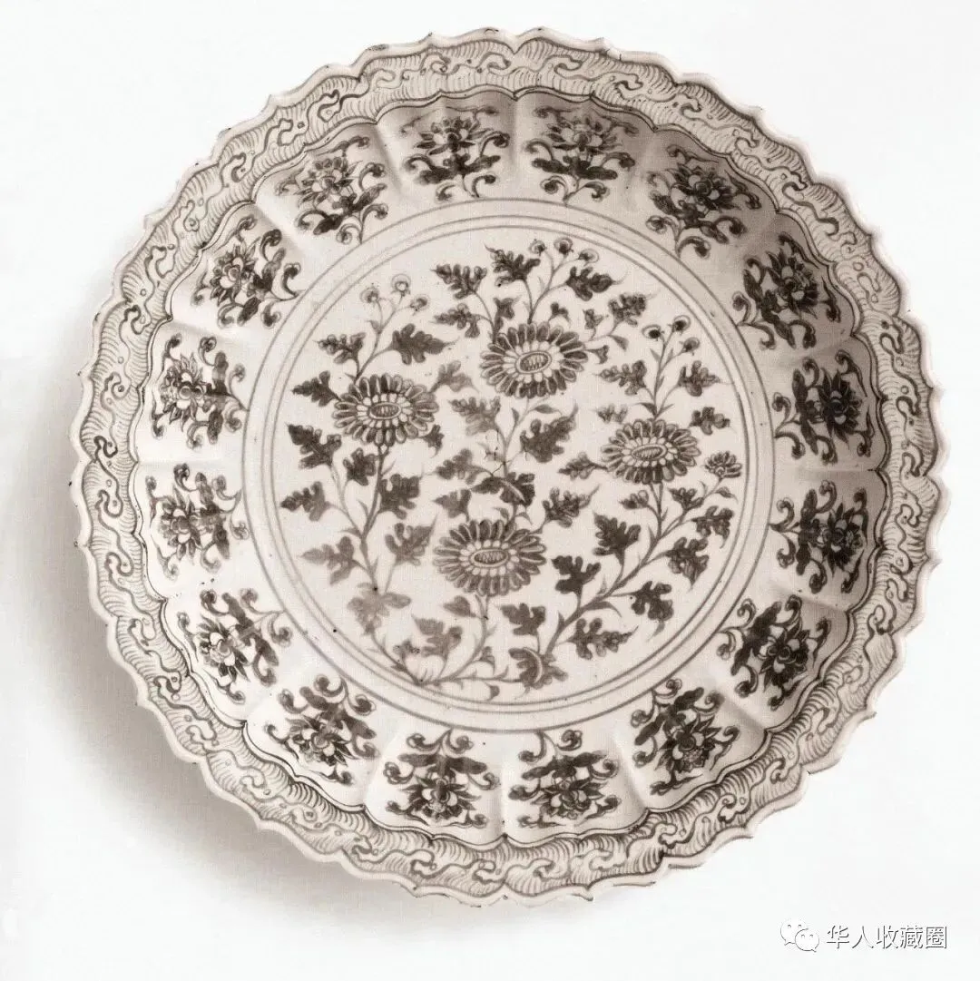 明洪武 釉里红缠枝扁菊纹菱口劝盘