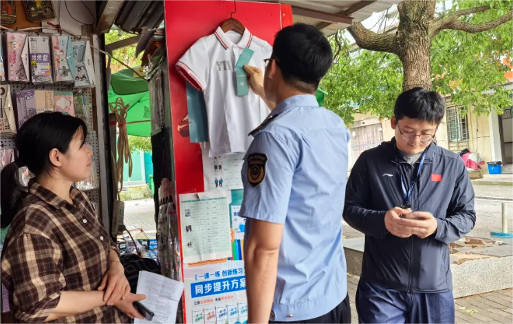 专项检查组聚焦校服生产源头、流通环节及学校使用端,重点核查生产企业资质、原材料进货查验、产品执行标准符合性,以及销售单位的索证索票、标识标注规范性;针对学校,严查校服采购程序合规性、价格公示透明度及是否存在强制购买、捆绑收费等问题。检查中,执法人员现场抽样送检1批次校服,查看检测报告13份,对5家销售单位存在的标识不完整问题当场下达责令整改通知书。同步向商户、学校发放《校服质量安全告知书》123余份,普及“看标识、查资质、验报告”选购常识。