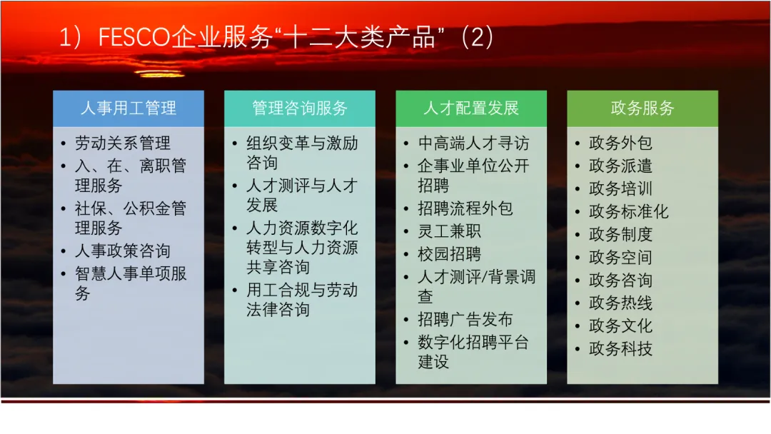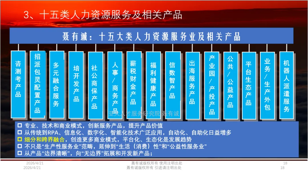 ——行业产品分类框架:我们将人力资源服务业产品分为15类,是目前行业内分类最细的框架,该分类框架历经15年持续迭代更新,曾为某知名企业提供产品培训。