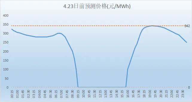 4月23日直调用电预测最大负荷3396.79万千瓦,最小2002.26万千瓦;新能源负荷出力最大2775.707千瓦,最小441.042万千瓦;外送电最大870.7万千瓦,最小455.8万千瓦;现货日前预测价格均价最大342元/MWh(19:15),最小0元/MWh(09:15-15:45),算术平均202.218元/MWh。