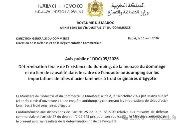 4月10日,北非钢铁贸易格局迎来剧变。摩洛哥工业与贸易部发布第DDC/05/2026号公告,对原产于埃及的未镀层、未涂层冷轧钢材征收反倾销税,4月13日起生效。