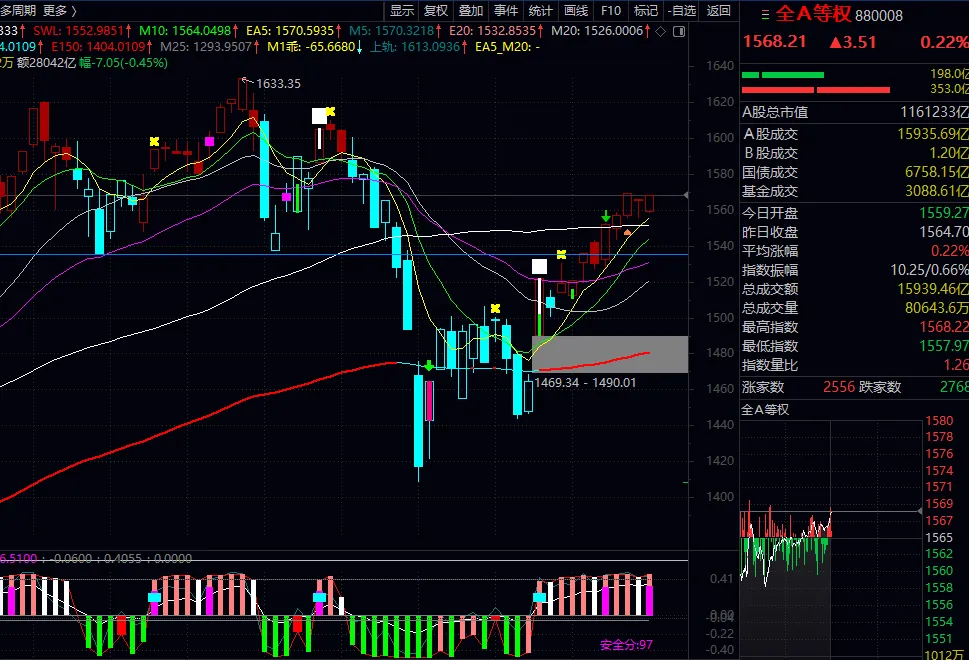 今日周三上午,A股在外盘下跌情况下低开,但随后开始震荡,全A指数开盘即为最低指数,以最高1568点收午盘,涨0.22%,离周一高点仅差一个点;成交15836亿,比上日增100亿,上涨2556家,比下跌少200家,说明高价股涨得更多。