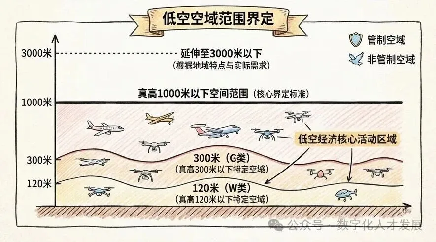 低空空域就像分层的 “空中高速”,高度越高,管制越严,对应的飞行器和场景也越复杂: