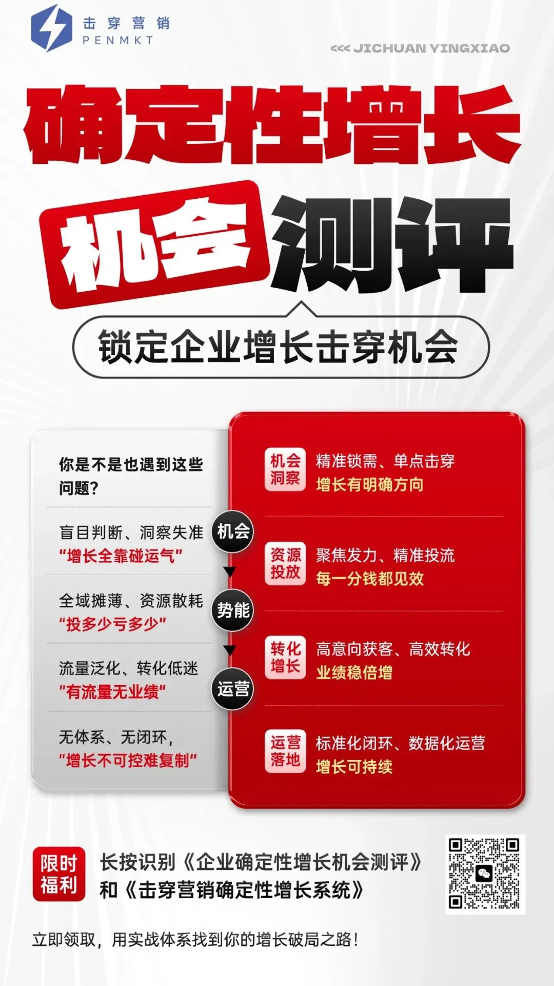 如果你也厌倦了盲目试错、厌倦了赌运气、厌倦了忙而无效、厌倦了业绩忽高忽低,欢迎了解击穿营销——一套真正为企业增长而生的确定性系统。