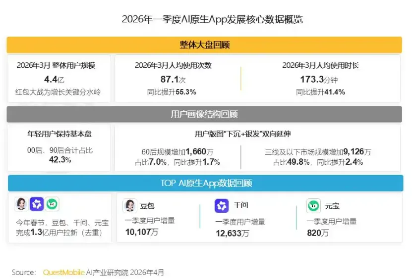 QuestMobile的数据显示,截止到2026年3月,我国AI原生APP的月活用户规模已高达4.4亿。