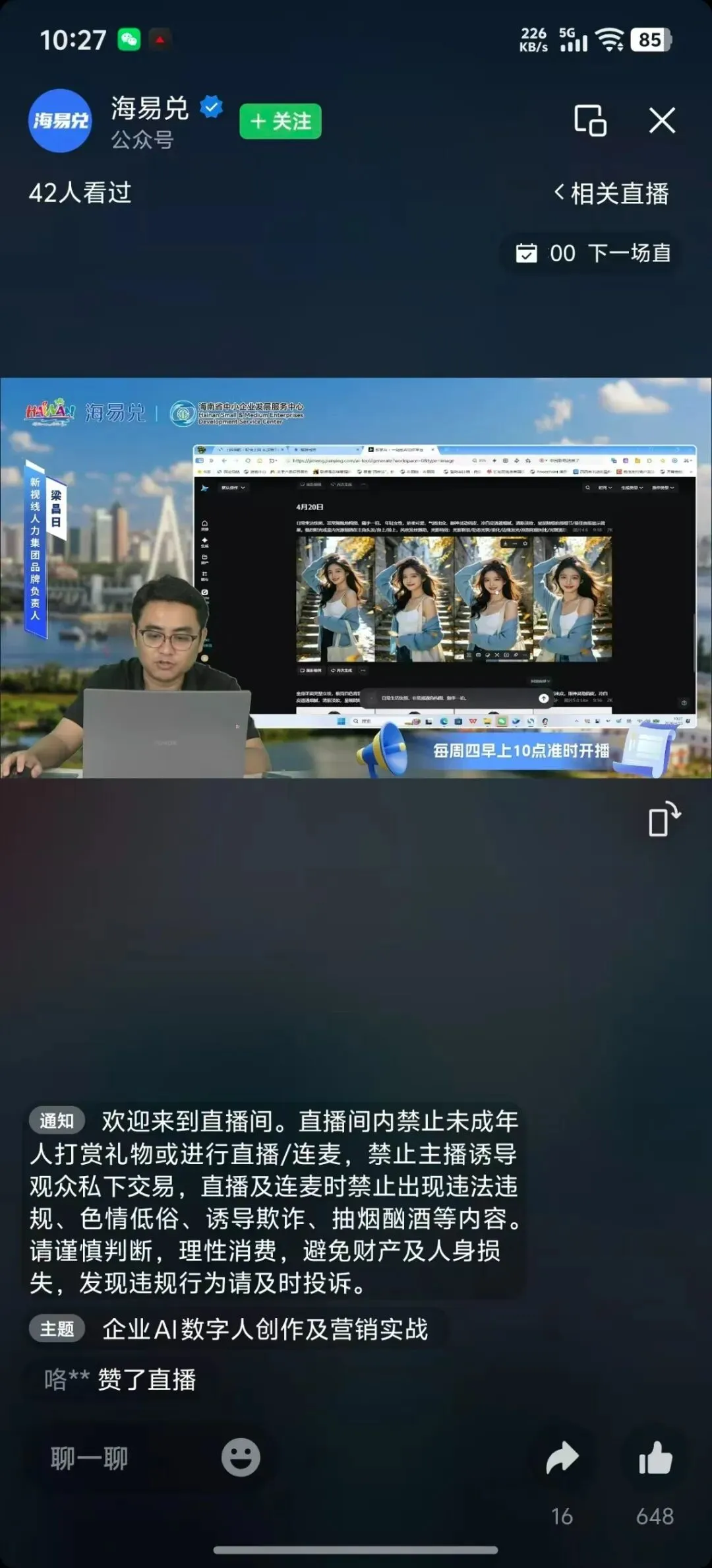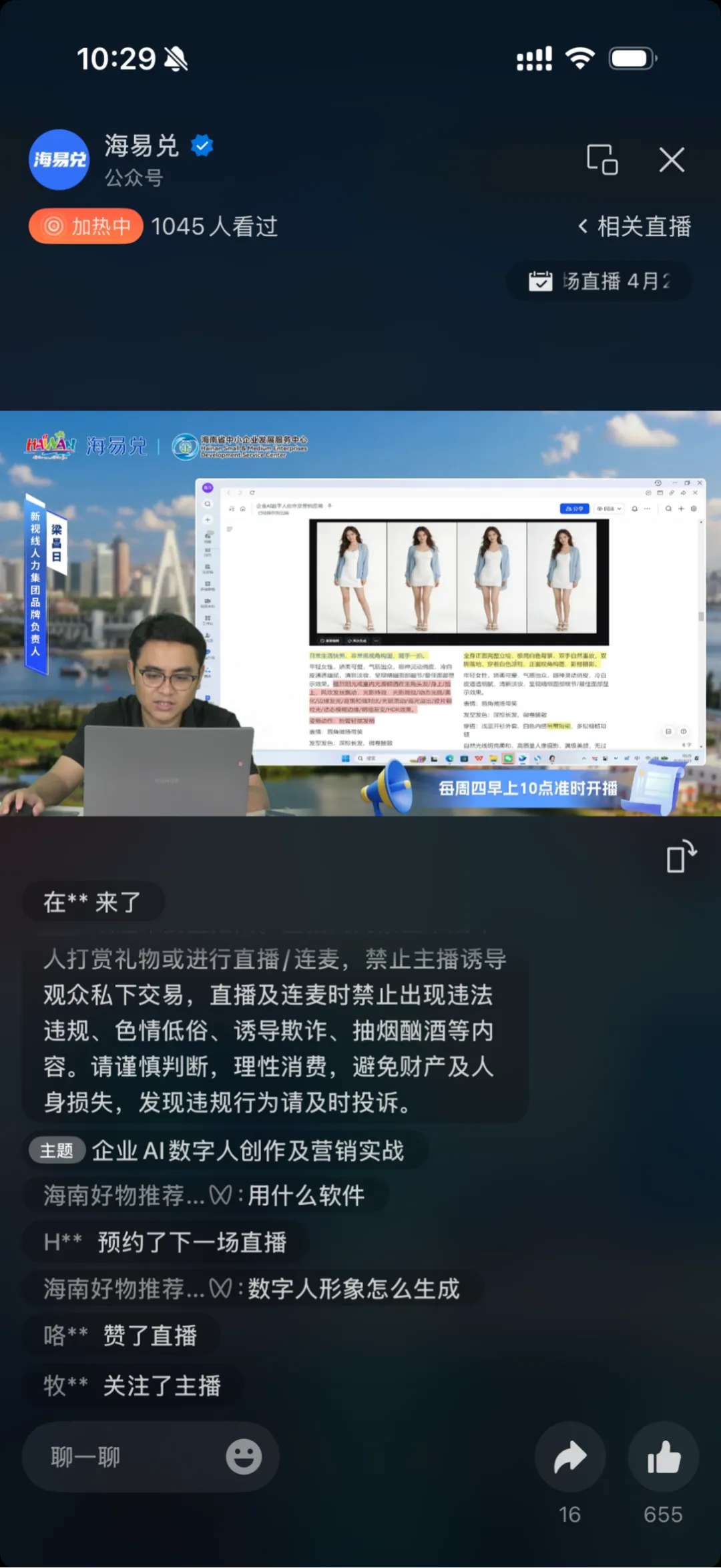 2026年4月23日上午10时,海南新视线人力集团品牌负责人梁昌日受邀走进海南省中小企业发展服务中心海易兑直播间,开展《企业AI数字人创作及营销应用》主题线上分享,面向全省中小企业普及AI数字人创作方法、应用场景与实战技巧,助力企业以低成本、高效率的AI工具升级营销模式、激活增长动能。
