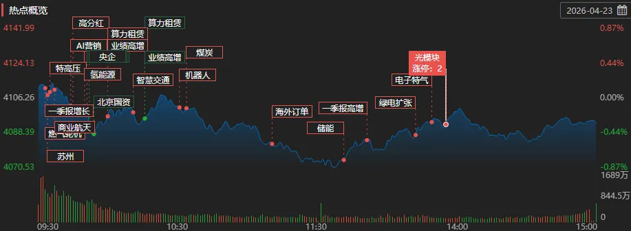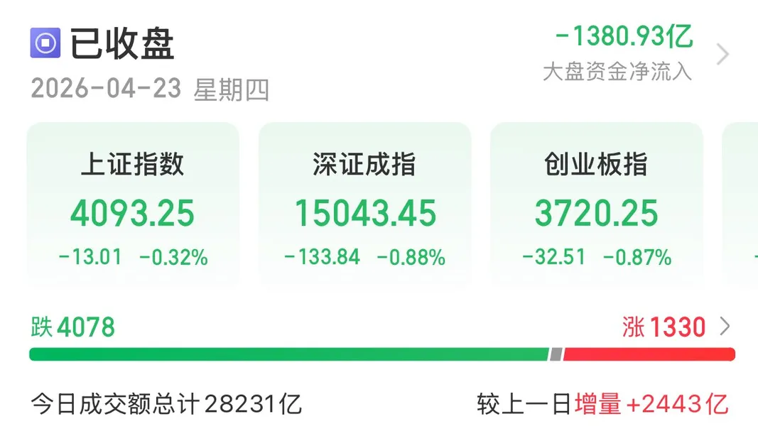 4月23日,A股高开低走,算力硬件产业链全线回调,市场逾4000股下跌。上证指数收跌0.32%报4093.25点,深证成指跌0.88%,创业板指跌0.87%,北证50跌3.04%,科创50跌1.28%,万得全A跌0.89%,万得A500跌0.51%,中证A500跌0.55%。A股全天成交2.82万亿元,上日成交2.58万亿元。