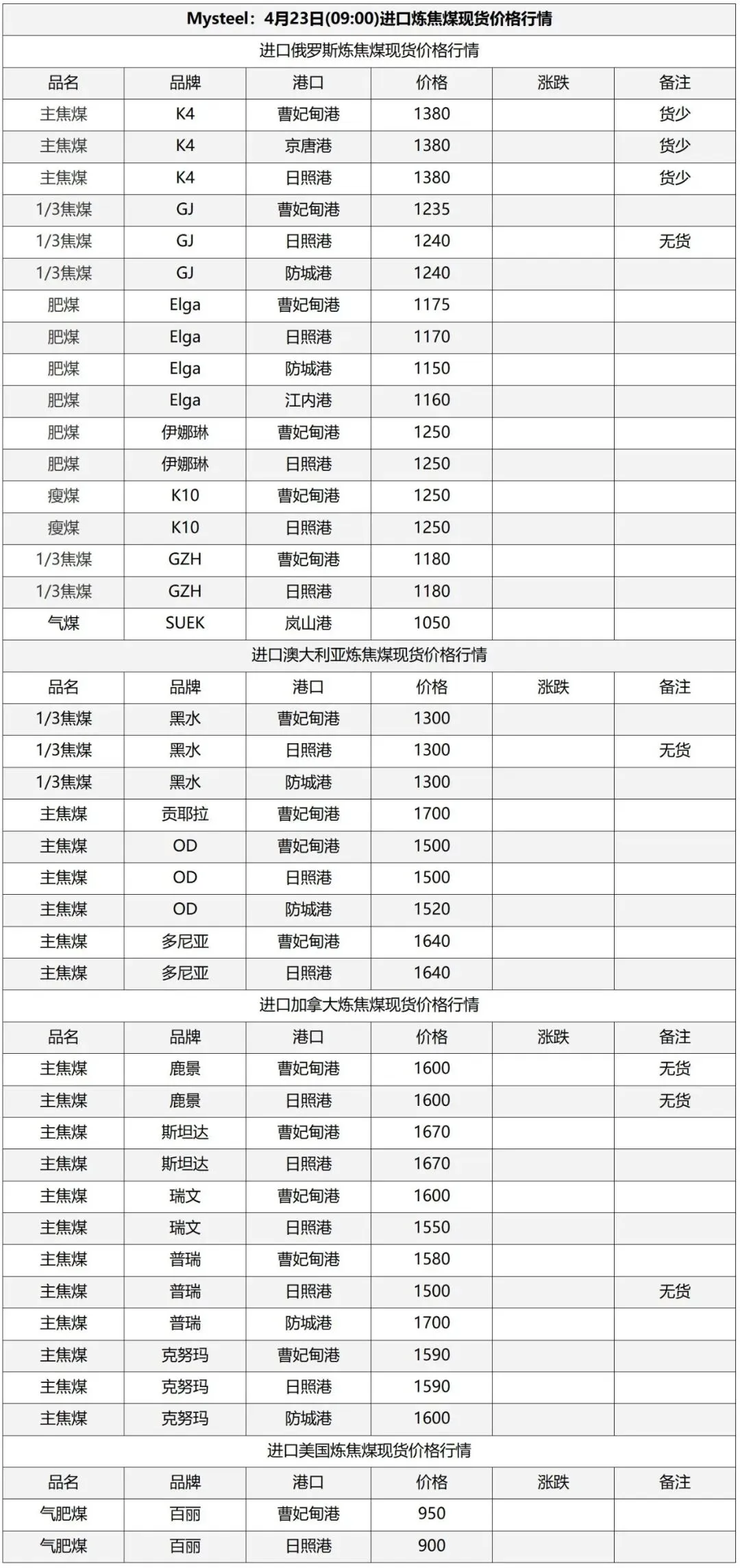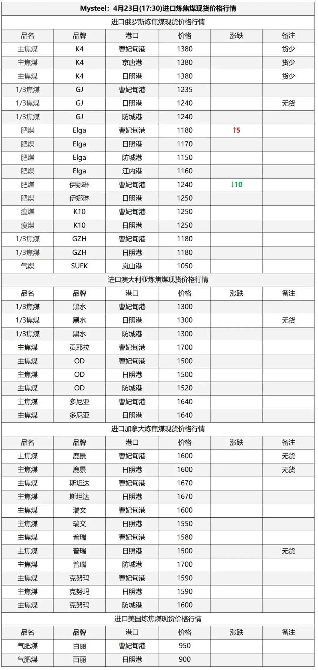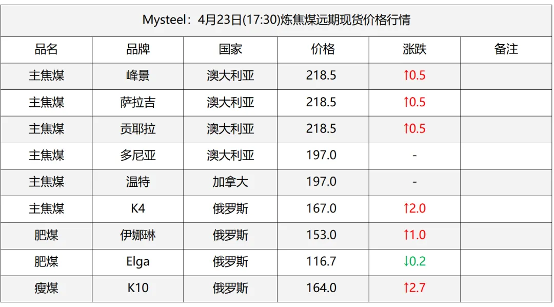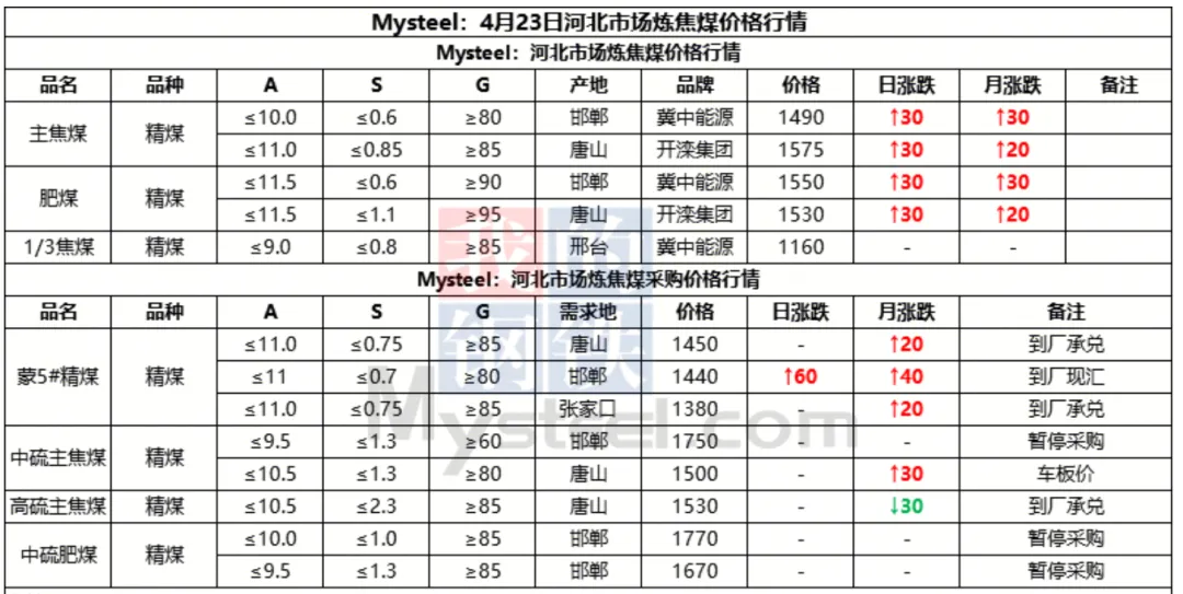 23日河北市场炼焦煤价格小幅上涨。供应方面,产地供应相对平稳,临近五一下游有一定补库支撑,市场成交整体温和放量,低价成交有所回暖,部分煤种报价上调。线上竞拍流拍率下降,主产地炼焦煤小幅上涨。需求方面,钢厂铁水产量小幅增加,焦炭第二轮提涨已落地,焦企利润得到修复,生产积极性尚可,需求稳定跟进。不过,下游采购偏刚性,缺乏持续放量,难以形成趋势性拉动。综合来看,预计短期内炼焦煤价格偏稳运行,部分市场价小幅上涨。