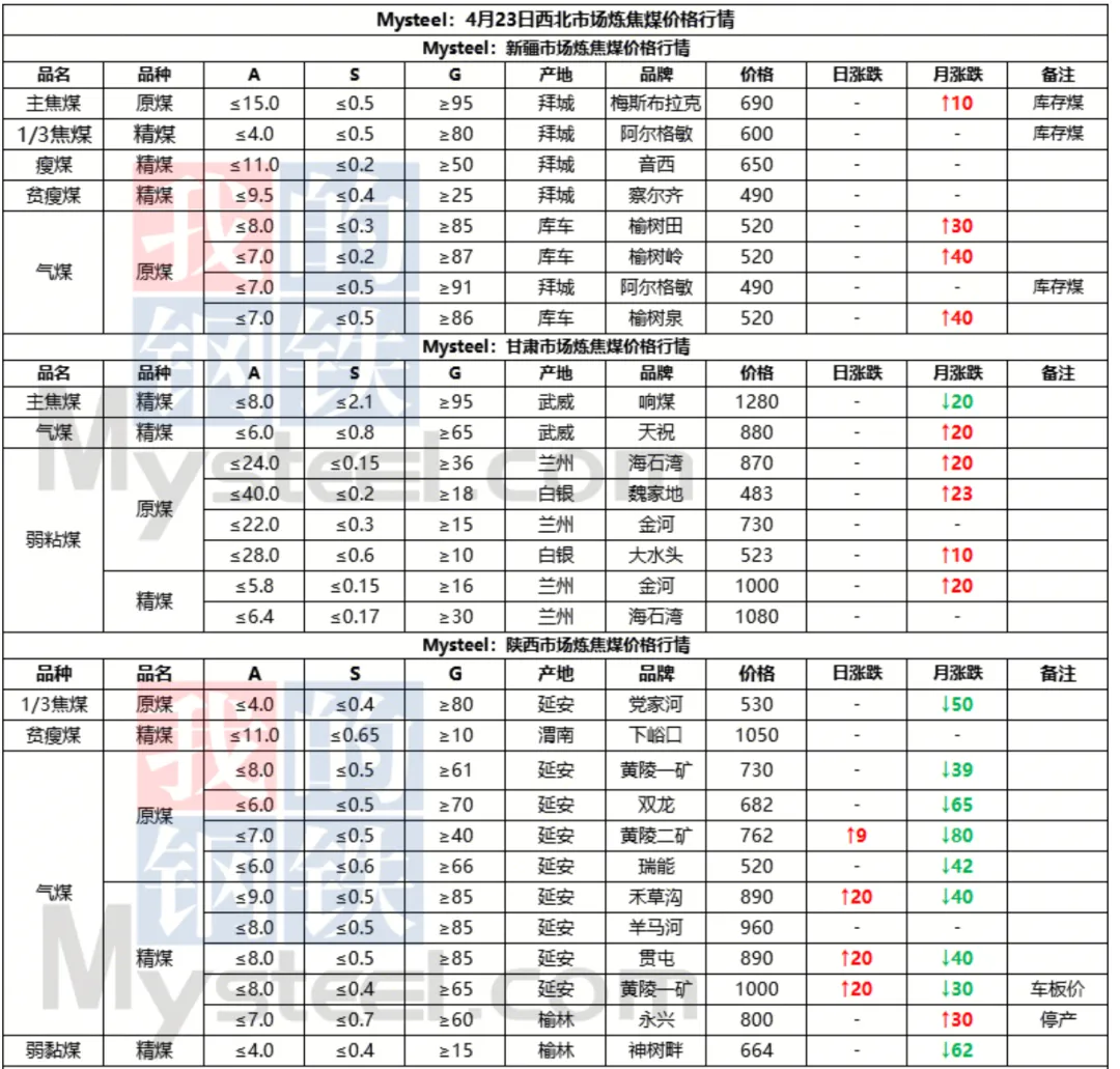 23日西北市场炼焦煤价格稳中偏强。供应端,新疆部分煤种库存偏高,陕西永兴精煤停产形成供应缺口,同时上游生产端成本上升叠加惜售情绪,推动供应价格普涨。需求端,下游对价格上涨接受度较高,主流煤种需求坚挺,带动价格上行;不同煤种需求分化明显,主焦煤、1/3焦煤等主流煤种需求强度远高于贫瘦煤、弱粘煤等品种。