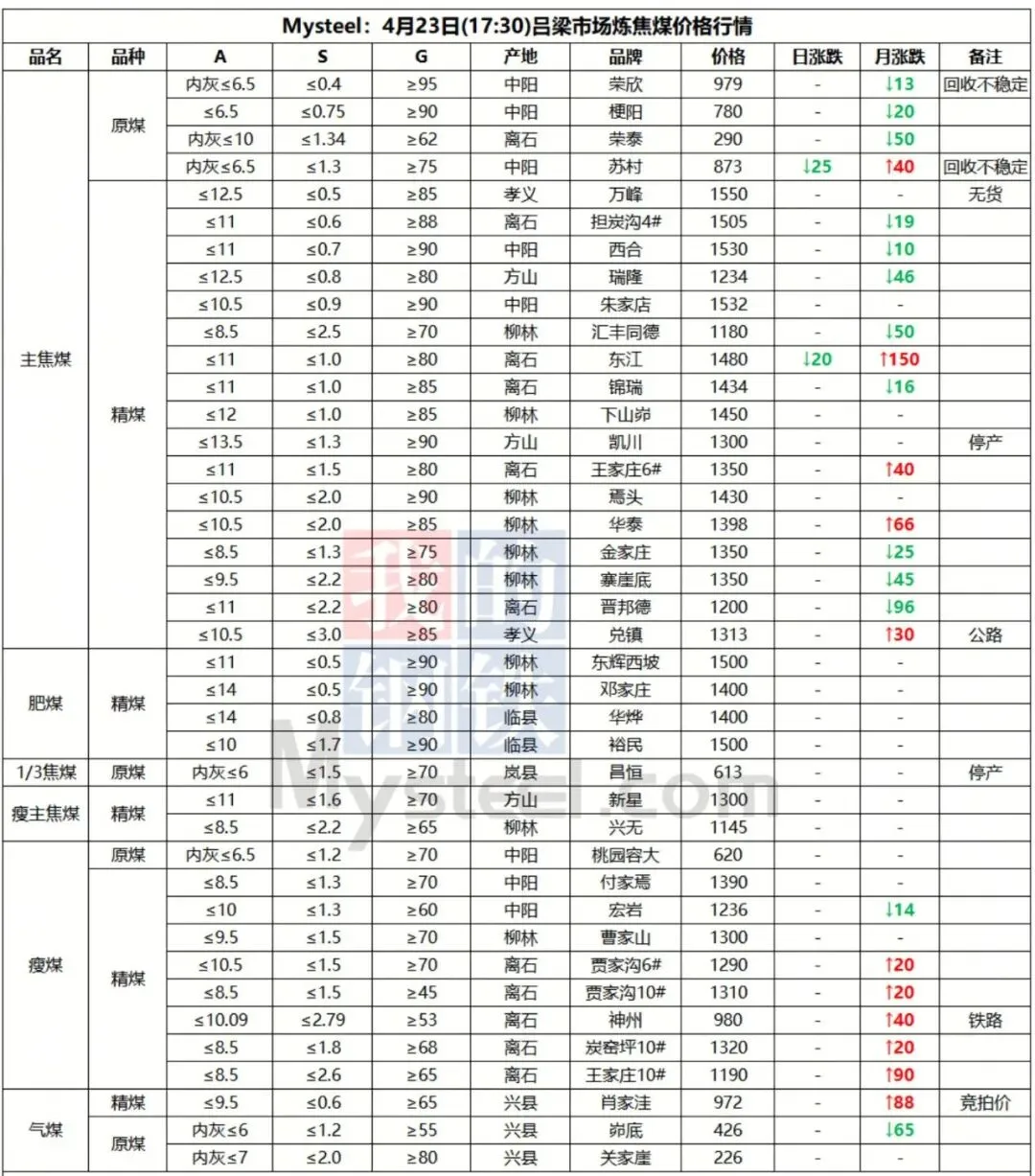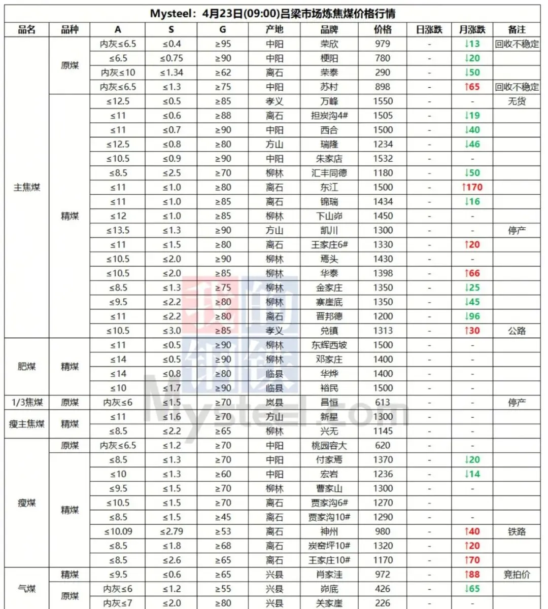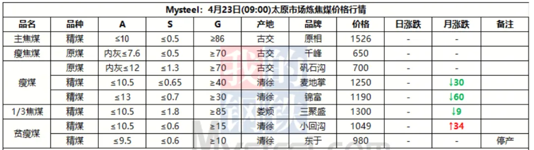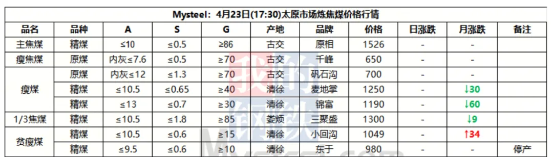 23日太原市场炼焦煤价格暂稳,区域内事故煤矿仍在停产当中,短期煤矿整体产量不高。五一假期临近,焦企释放补库需求,铁水产量回升进一步改善煤焦需求,市场预期焦炭后续仍有提涨诉求,短期预计煤价仍将偏强窄幅震荡行情为主。现古交低硫主焦煤出厂含税价1526元/吨;清徐瘦煤出厂含税价1250元/吨。