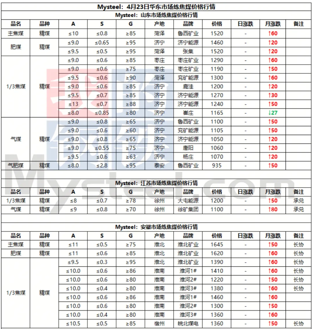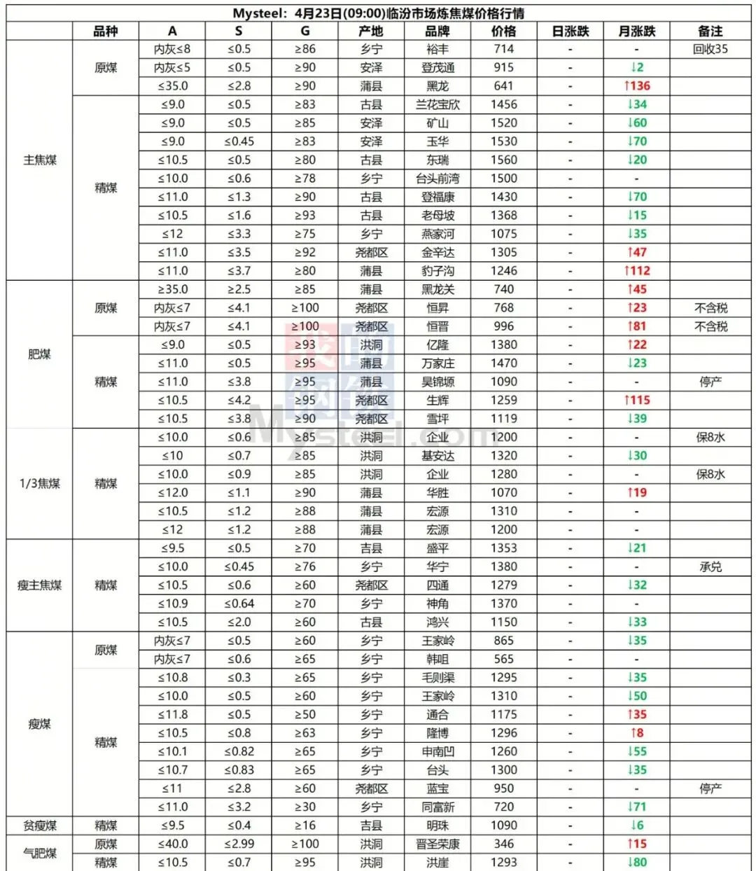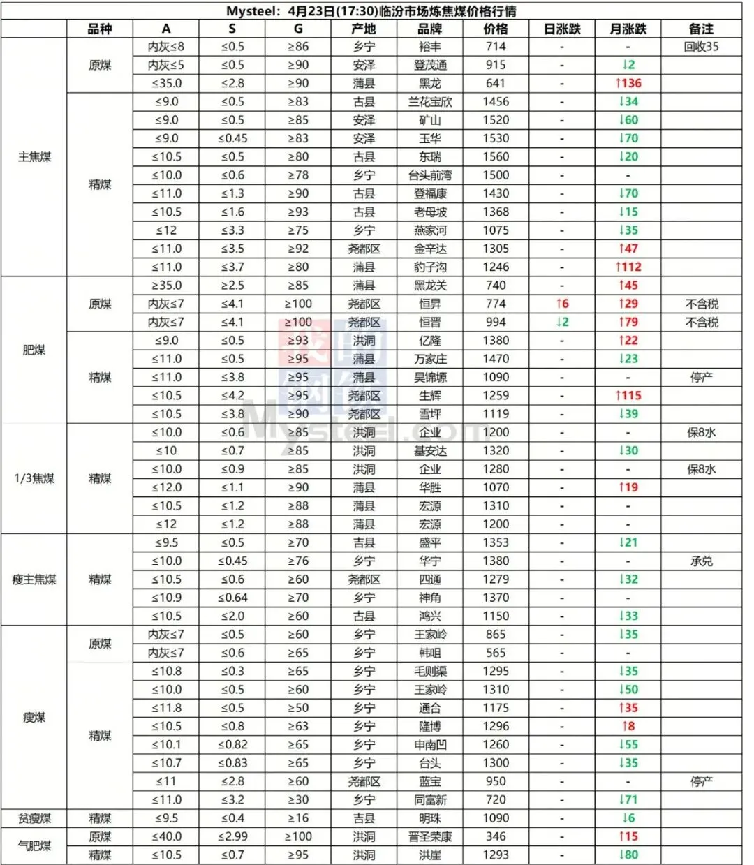23日太原市场炼焦煤价格暂稳,区域内事故煤矿仍在停产当中,短期煤矿整体产量不高。五一假期临近,焦企释放补库需求,铁水产量回升进一步改善煤焦需求,市场预期焦炭后续仍有提涨诉求,短期预计煤价仍将偏强窄幅震荡行情为主。现古交低硫主焦煤出厂含税价1526元/吨;清徐瘦煤出厂含税价1250元/吨。