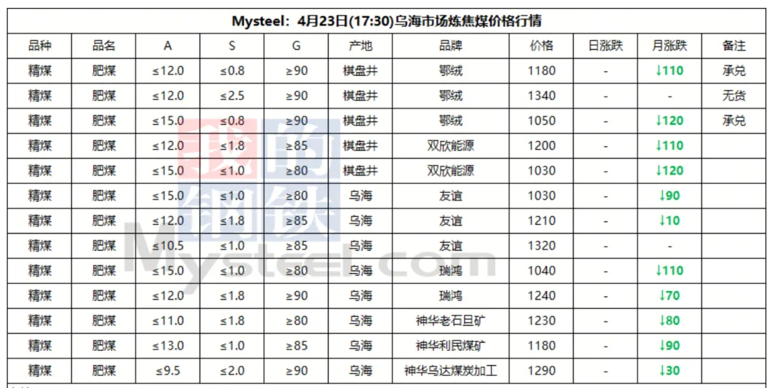 23日乌海市场炼焦煤偏稳运行。据Mysteel调研,本周唐山主流样本钢厂平均盈利水平大幅提升,对原料刚性需求不减,市场情绪向好,对焦炭价格仍有第三轮提涨预期;然乌海地区焦化企业采购原料煤仍偏谨慎,当地炼焦煤实际成交情况未见明显提升,洗煤企业多维持前期报价,观望节前下游补库需求释放,短期乌海市场炼焦煤暂稳运行。