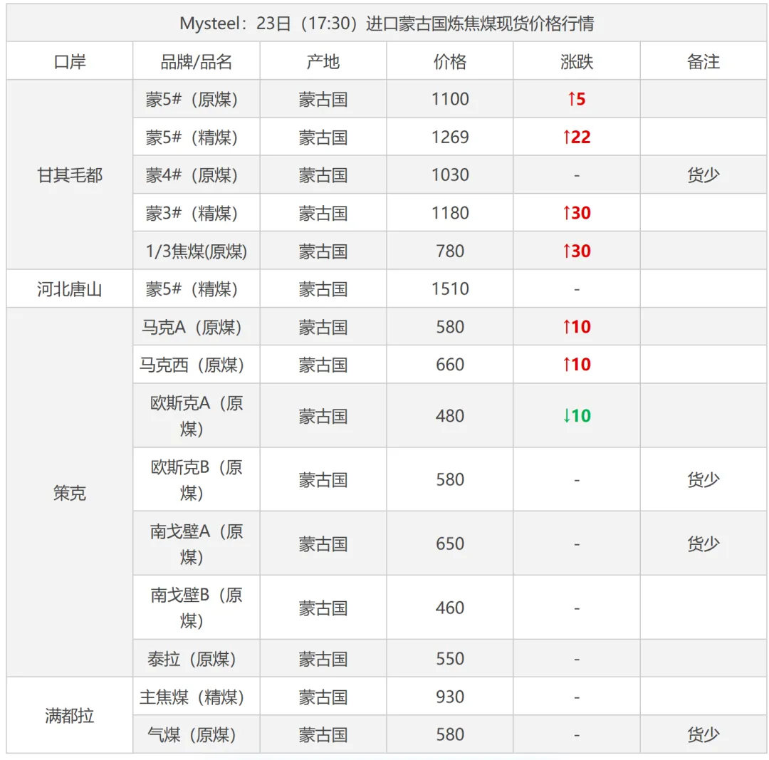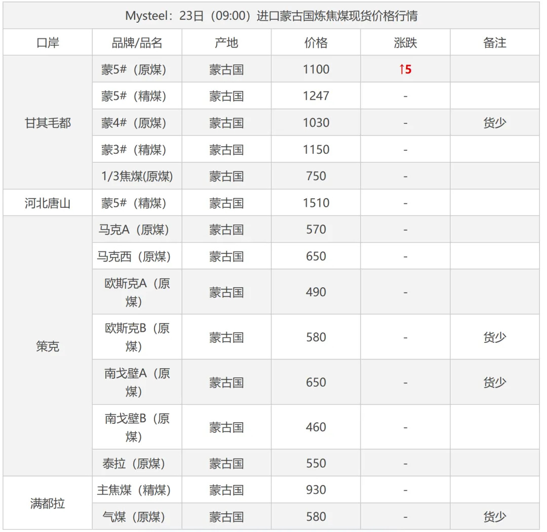 23日晨间进口蒙古国炼焦煤市场偏强运行。临近五一假期,终端企业节前刚需备货下采购有所增加,但依旧按需采购为主,蒙煤市场因期货盘面带动主焦煤报价上调,但实际成交价一般,市场情绪有所回暖,国内焦炭三轮提涨预期仍存,预计短期炼焦煤价格震荡偏强运行,后续市场价格走势仍有待观望。