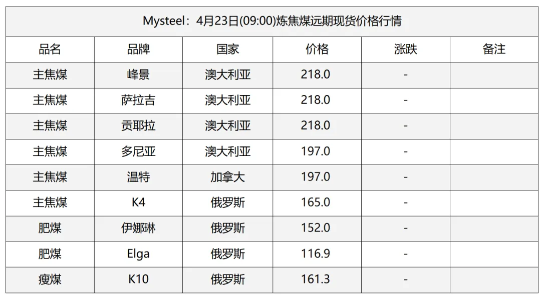 23日进口炼焦煤远期市场暂稳运行。澳大利亚远期海外炼焦煤一线主焦CFR218.0美金/吨,日环比暂无变化。澳大利亚远期炼焦煤国际市场供应预期小幅改善,国际市场终端焦钢企业需求一般,价格支撑相对不足。俄罗斯远期炼焦煤市场暂稳运行,部分贸易商对远期货物观望态度持续,询价行为仍存,采购较为谨慎。远期主流品牌价格如下: