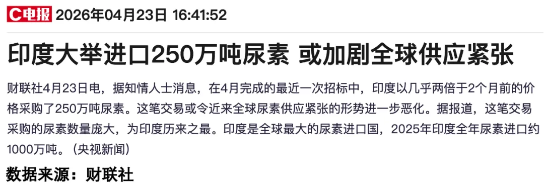 有人可能会说,我也知道市场情绪会好,这种太没有营养了,其实市场看淡中东局势的影响,并不意味着一切都没有改变,相反我之前也说过,恐慌性的购买会很快到来,毕竟如果封锁一直持续,那么最先倒下的未必是美伊,而是其他地区,这不今天就爆出印度方面一口气购买了250万吨尿素,这就是战争的影响。