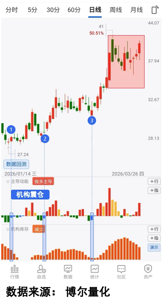 就像我前面说的,机构资金的做盘必然是提前的,只要看懂机构行为,一切问题就迎刃而解,就像下面的图,除了大家通常看到的K线图,还包含了我用了十多年的大数据系统提供的「交易行为数据」,通过量化后的交易行为数据,就会看到截然不同的一幕。