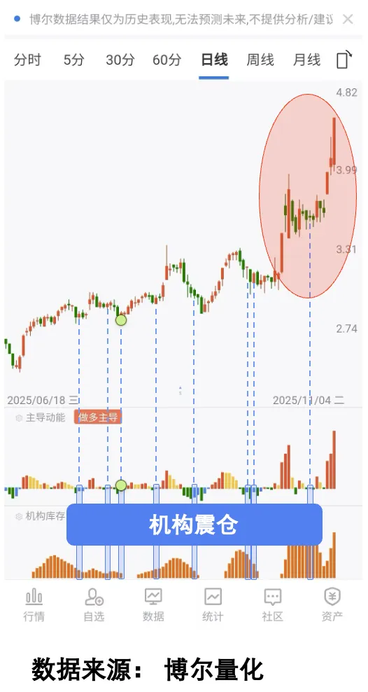 图中K线下方的红、黄、蓝、绿四种柱体,反映的就是具体的交易行为,其中蓝色代表空头回补行为,就是前期做空资金重新入场,而红黄蓝绿柱体下方的橙色柱体就是反映机构行为活跃程度的「机构库存」数据。如果交易行为下方对应有「机构库存」数据,说明这一天主要的交易行为是机构发动的,试想下,当前期做空的机构重新开始买入,这是不是一种「洗盘」手法,说白了就是利用股价下跌来制造恐慌,逼得小散把手中的筹码给交出来,很明显,在股价上涨之前,短期内频繁出现「机构震仓」现象,这就是机构做盘的铁证,那时候就可以关注起来了。而且从数据上来看,「震仓」出现的时候,往往是调整结束的时候,是低位。