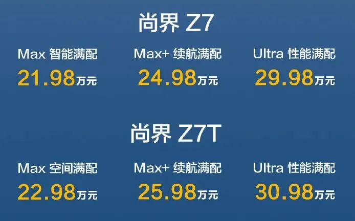 这次新上市的“尚界”系列有两款车:轿跑风格的Z7,另外是猎装车(一种融合了轿车操控和SUV大空间的车型)风格的Z7T。每款车都分了三个档次:Max(标准版)、Max+(长续航版)和Ultra(顶配版),让大家有了更多的选择。