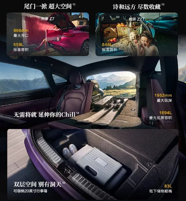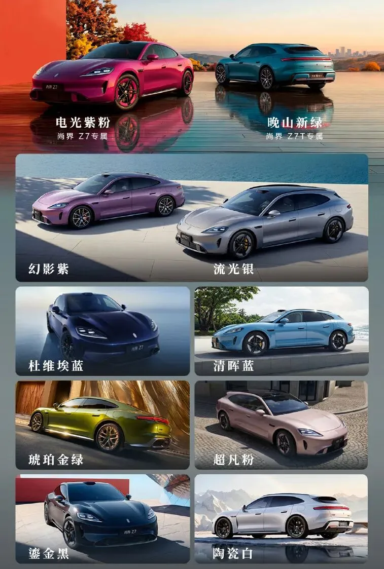 外观方面,尚界Z7与Z7T同平台开发但风格各异。Z7采用溜背轿跑造型,线条流畅动感,专属电光紫粉车漆辨识度高;Z7T则为猎装设计,车尾线条舒展,强化休旅气质的同时,带来更优的后排头部空间与后备厢装载能力,适配多元户外场景。