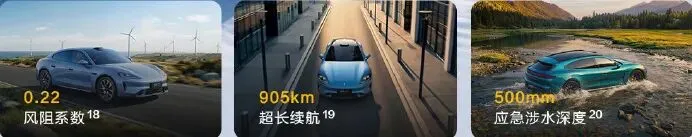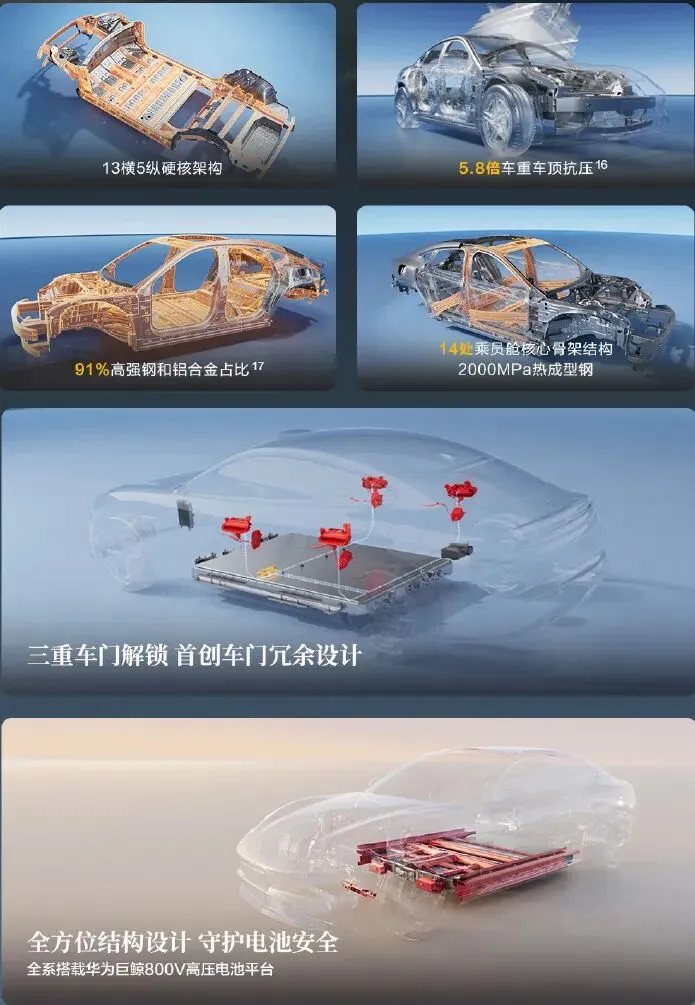 三电系统方面,新车全系标配华为巨鲸800V高压电池平台,采用5层电芯安全包裹等多重设计,配合7×24小时全天候BMS云端看护,可有效防范高压爆燃风险。高配版本搭载100kWh三元锂电池,CLTC工况最长续航905公里,快充5分钟可补能超200公里;500mm标称涉水深度进一步提升出行保障。